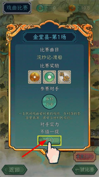 3、參與戲曲比賽,選擇對應的場次,查看比賽曲目和獎勵,確認對手實力后點擊開始,即可參與這場戲曲比拼。