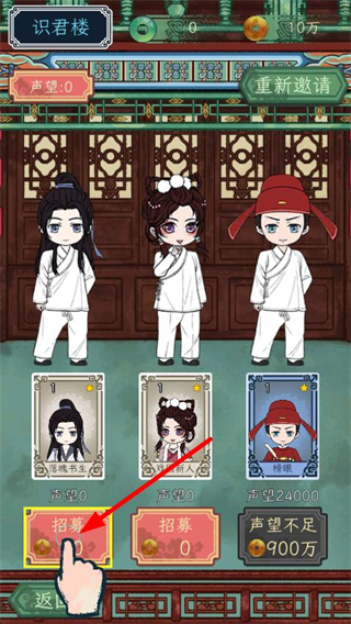 2、在識君樓界面,可招募不同的角色,點擊對應角色下方的招募按鈕,消耗資源獲取角色,積累戲園所需的人員配置。