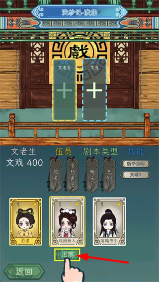 4、在戲曲表演界面,選擇合適的角色點擊出演,搭配對應的劇本類型和技能,完成這場戲曲表演,推進戲園的發展進程。
