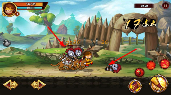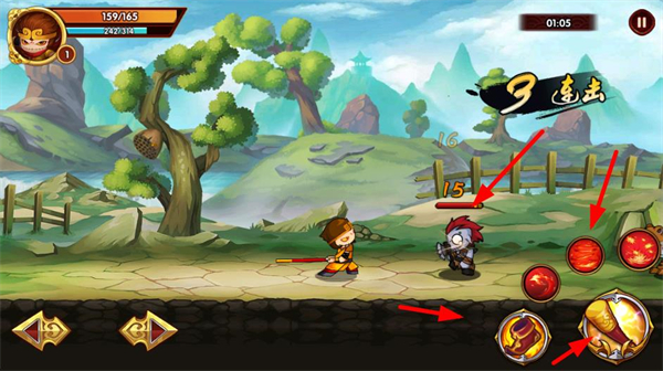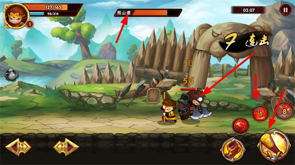 1、操控角色攻擊敵人,打出連擊,點擊技能按鈕釋放技能,提升戰斗傷害,推進關卡進程。