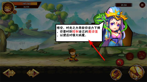 2、有劇情提示,告知需控制魔法值應對大妖魔,跟隨劇情指引,了解游戲機制,繼續冒險。