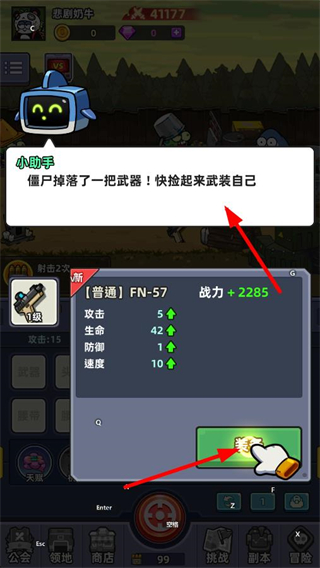 3、僵尸會掉落武器,撿起武器武裝自己,提升戰力、攻擊等屬性,增強生存和戰斗能力。