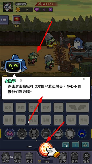 2、遇到僵尸時點擊射擊按鈕發起射擊,阻止僵尸靠近,通過戰斗提升射擊技巧,積累戰斗經驗。