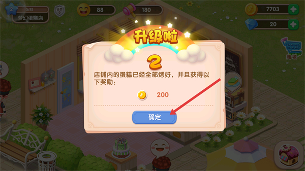 1、店鋪升級時會獲得獎勵,如升級到2級可獲得200金幣,點擊確定按鈕領取獎勵,繼續經營蛋糕店。