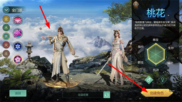 1、選擇桃花門派角色,點擊創建角色,進入武俠世界,開啟門派修煉與江湖冒險之旅。