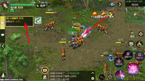 2、完成小試身手主線任務,擊敗猛虎,獲取經驗和獎勵,提升戰力,解鎖新技能和玩法。
