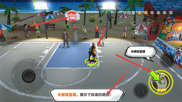 3、長按投籃鍵可展示標準跳投,瞄準籃筐投籃,不斷練習投籃技巧,提升得分能力。