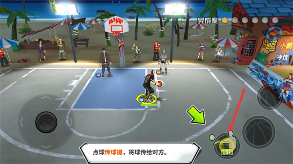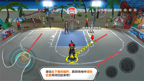 1、滑動左下角搖桿,跑到場地中球的位置將球撿起來,開始籃球競技,體驗街頭籃球的樂趣。