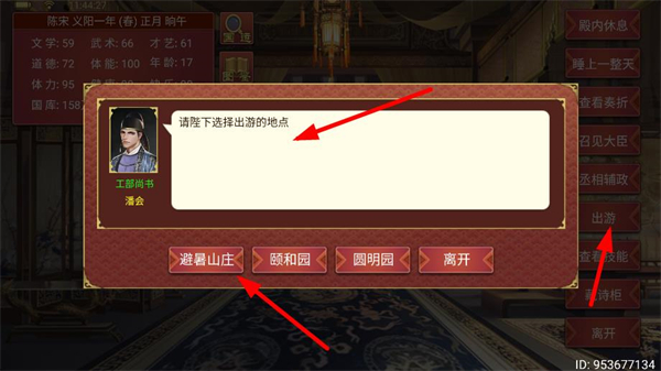 2、可選擇出游地點,如避暑山莊、頤和園等,點擊對應地點按鈕,開啟帝王出游行程。