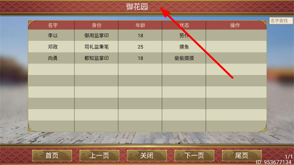 3、在御花園場景,可查看如李以等太監的身份、年齡、狀態等信息,了解宮廷人員情況。