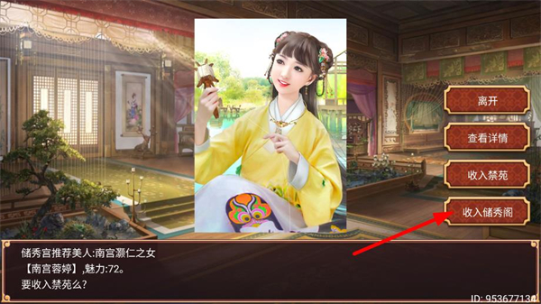 4、可對推薦的美人如南宮容卿進行操作,選擇收入禁苑或儲秀閣等,充實后宮陣容。