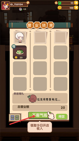 4、營業結束后,進入營業結束界面,可看到今日開店收入等信息,點擊不客氣啦,即可領取今日開店收入。