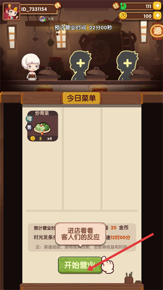 1、在今日菜單界面,可看到炒青菜等菜品,點擊開始營業,即可開啟餐廳營業流程,看看客人們的反應。