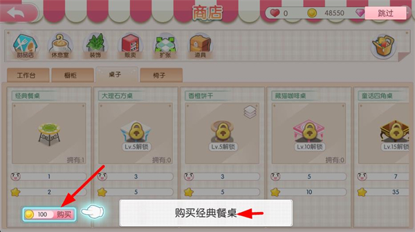 4、在商店可購買經典餐桌等設施,花費金幣購買后可布置店鋪,優化店鋪環境,助力經營。