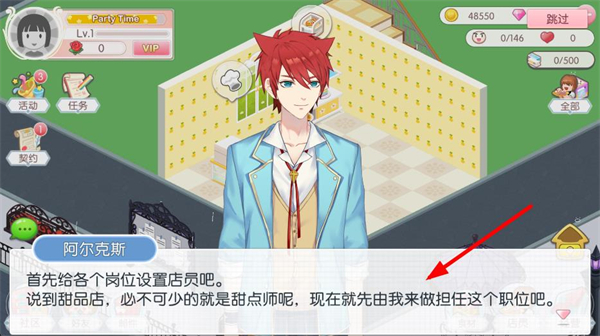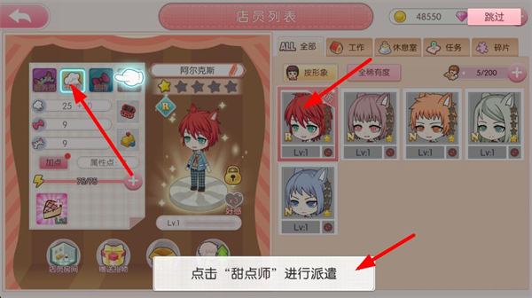 1、給甜品店各個崗位設置店員,首先讓阿爾克斯擔任甜點師,開啟甜品店經營。