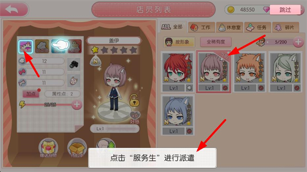 3、還可選擇蓋伊點擊服務生進行派遣,安排其擔任服務生崗位,合理分配店員,提升店鋪運營。