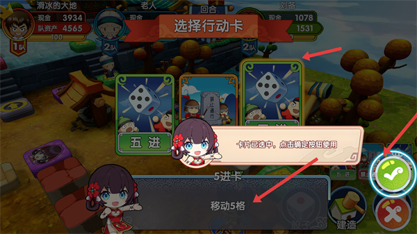 3、選擇行動卡如五進卡,點擊確定按鈕使用,可移動相應格數,推進游戲進程。