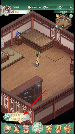 1、可在室內場景操控角色,點擊客棧按鈕可進入相關場景,開啟仙俠冒險的不同環節。