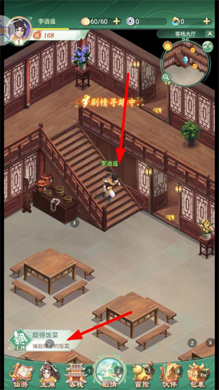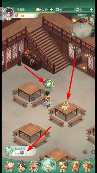 3、在客棧大廳可進行收拾大堂等操作,點擊飯菜等元素,完成對應的任務,獲取游戲進度獎勵。