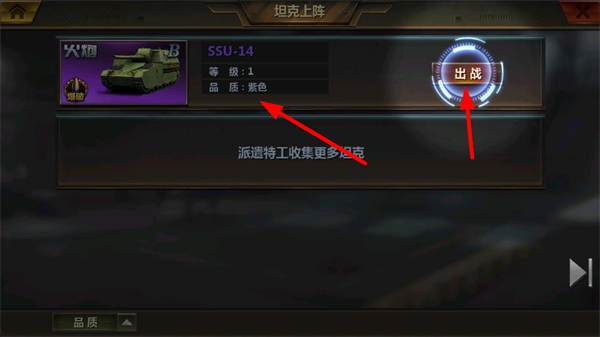 1、在坦克上陣界面,選擇已有的坦克,點擊出戰按鈕,派遣坦克參與戰斗,開啟戰場對決流程。
