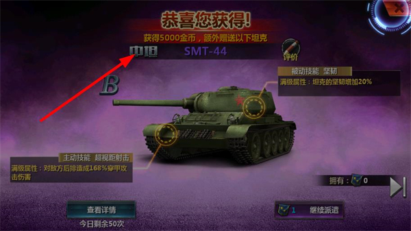 4、獲取新坦克后,查看其主動技能等屬性,點擊繼續派遣,積累更多坦克資源,豐富戰場陣容選擇。