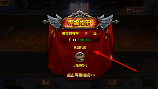 3、等級提升后,界面顯示開啟的新功能,點擊屏幕繼續,解鎖上陣坦克等新權限,強化戰斗配置。