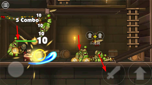 4、持續操控攻擊按鈕攻擊敵人,同時利用移動和跳躍功能調整站位,逐步擊敗場景里的敵人推進關卡。
