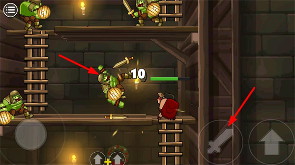 2、在戰斗場景里操控攻擊按鈕,對出現的敵人發起攻擊,同時借助跳躍按鈕調整位置,提升戰斗效率。