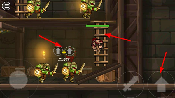 3、使用二段跳功能,操控角色跳上木梯,切換到不同的戰斗區域,繼續與敵人展開對抗。
