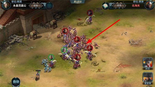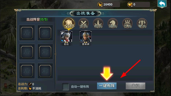 1、在出戰準備界面點擊一鍵布陣,快速組建出戰陣容,搭配武將和兵種,提升部隊戰力,為出征做準備。