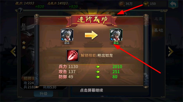 4、可讓武將進階,如趙云進階后解鎖技能槍出如龍,提升武將屬性和戰力,增強部隊戰斗能力,助力勢力發展。