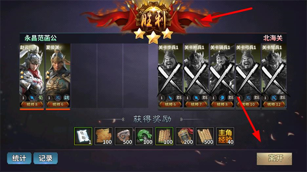 3、戰斗勝利后可獲得獎勵,點擊離開結算界面,繼續挑戰新關卡或培養武將,提升部隊整體實力。