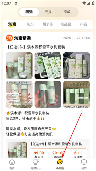 4、切換至小圈板塊選擇淘寶精選分類,瀏覽推薦的商品列表,找到目標商品條目,點擊進入該商品的詳情頁面查看信息。
