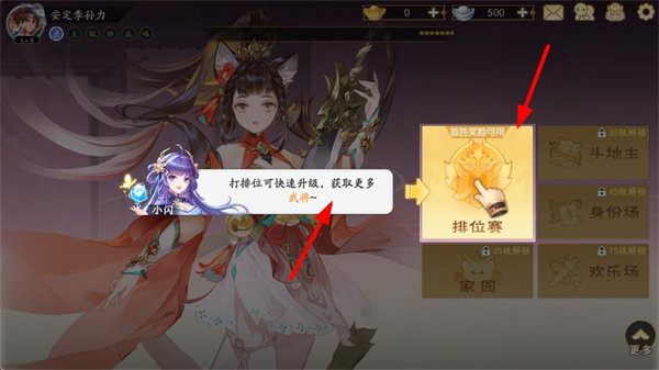 4、參與排位賽,通過打排位快速升級,獲取更多武將,提升游戲等級和戰力,解鎖新游戲內容,體驗競技對戰樂趣。