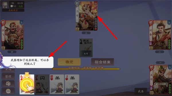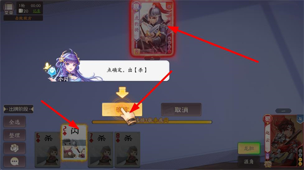 1、使用手牌閃,躲避敵方攻擊,維持自身體力,在對戰過程保存戰力,點擊確定執行出牌策略,推進對戰進程。