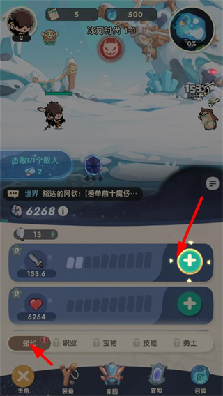 2、強化角色屬性,點擊加號提升主角的攻擊、生命等屬性,增強角色的戰斗能力,應對時空怪物。