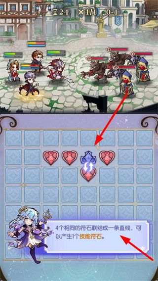 2、當4個相同的符石聯結成一條直線時,可產生技能符石,利用技能符石釋放技能,增強戰斗能力。