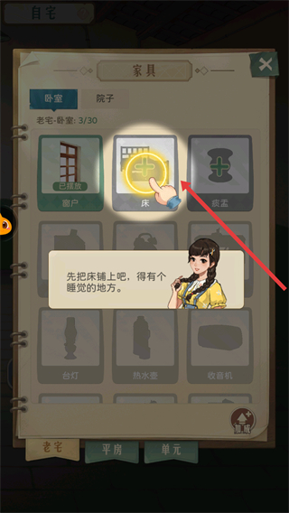 4、整理好自宅后,可進入家具界面,選擇床等家具進行布置,先把床鋪好,讓自宅有睡覺的地方,提升居住條件。