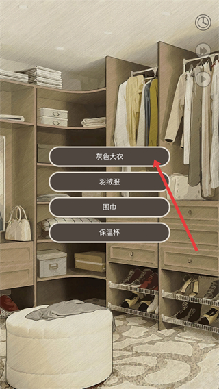 4、在衣柜場景有灰色大衣、羽絨服、圍巾、保溫杯等選項,玩家選擇一個,為角色搭配物品。