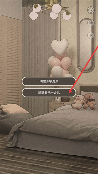 2、在臥室場景會出現叫醒澤宇洗澡、靜靜看他一會兒的選項,玩家可選擇一個。