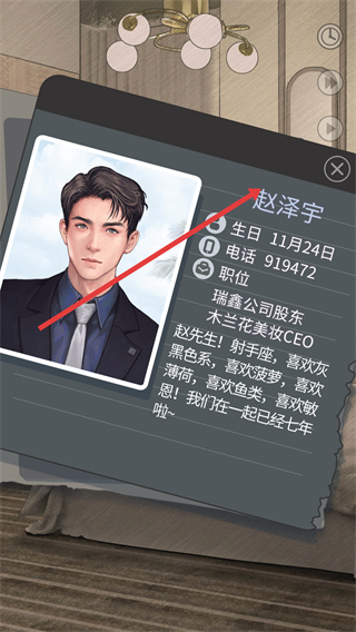 1、會出現角色趙澤宇的信息界面,展示其生日、電話、職位等詳細內容,讓玩家初步了解角色背景。