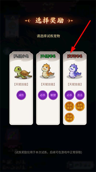 4、選擇寵物獎勵如變異小蛇,其具備必殺、連擊等天賦技能,加入后增強角色戰力,助力試煉和冒險。