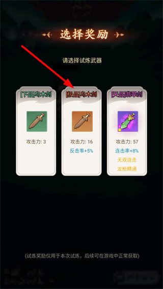 2、試煉勝利后選擇武器獎勵,如極居烏木劍,提升攻擊力、反擊率等屬性,增強角色在試煉過程的戰力。