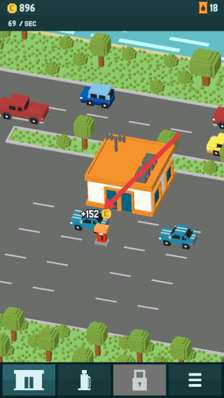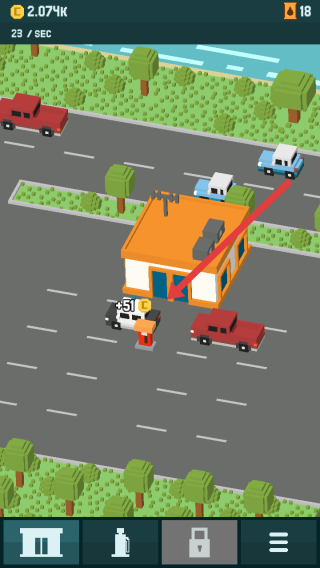 1、游戲像素風格的場景里,經營加油站,車輛會來到加油站前,準備為其提供加油服務,獲取金幣。