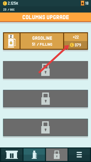 2、進入升級界面,可對汽油相關項目進行升級,花費金幣能提升汽油的填充等屬性,助力更好經營加油站。