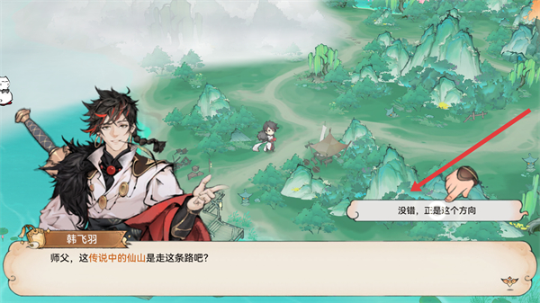 1、有劇情對話,韓飛羽會詢問師父關于仙山的路線,通過對話了解任務線索,推進劇情發展。