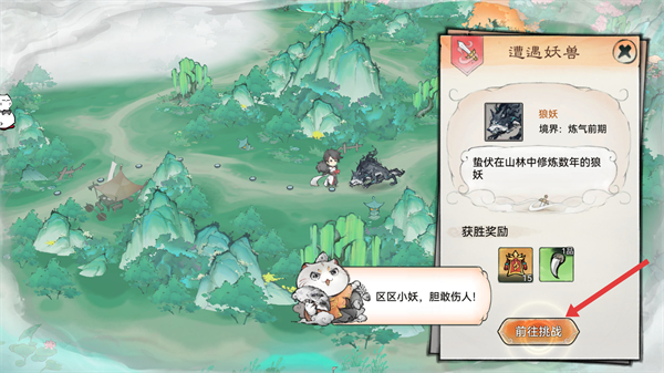 3、遭遇妖獸時,能查看妖獸信息,像狼妖的境界等,然后點擊前往挑戰,與妖獸展開戰斗,檢驗實力。