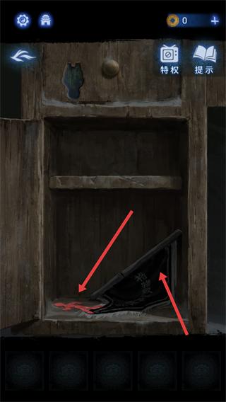 3、打開木柜后,可拾取紅色物品和黑色錦旗等道具,收集這些物品用于后續解謎,探索木柜內的隱藏內容。