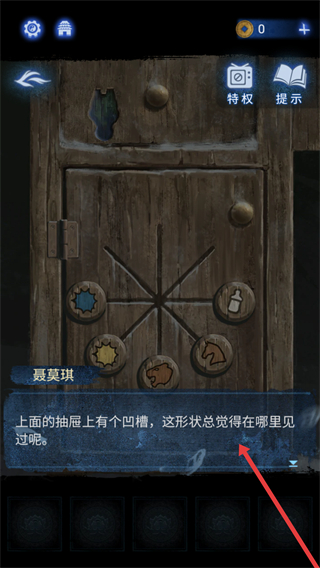 2、看到帶有不同圖案按鈕的木柜,聶莫琪會提示抽屜凹槽形狀有印象,需根據提示回憶線索,破解木柜謎題。