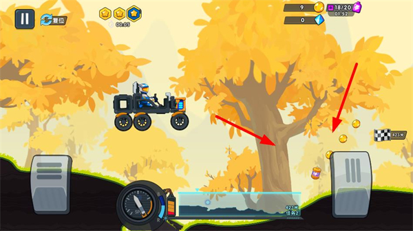 2、操控組裝好的賽車在賽道行駛,收集路徑上的金幣和物品,界面顯示距離和任務進度,朝著終點方向推進關卡。